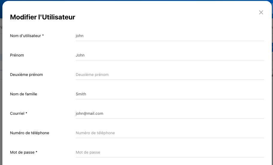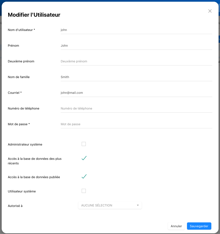 - Les administrateurs système peuvent éditer le Nom d’utilisateur, le Prénom, le Deuxième Prénom, le Nom de famille, le Courriel, le Numéro de téléphone et le Mot de passe.