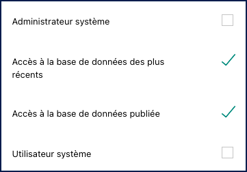 - Les administrateurs système peuvent accorder l’accès administrateur système, la base de données des plus récents (pour voir tous les objets), la base de données publiée (pour voir uniquement les objets publiés) ou utilisateur système.