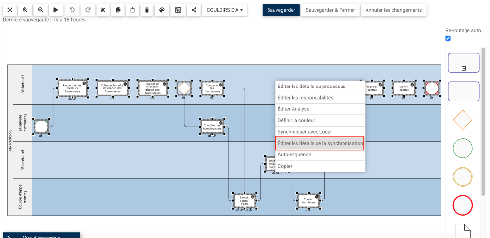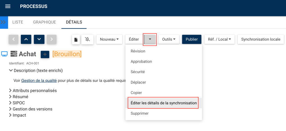 2. Accédez à la page Détails ou Graphique de l’objet processus ou flux Source. Cliquez sur le menu Edition et sélectionnez “Éditer les détails de la synchronisation”.