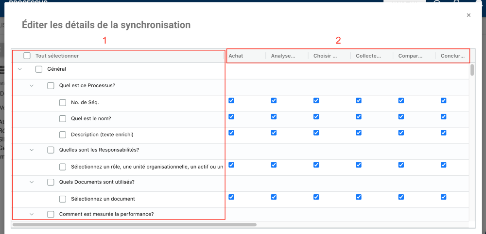 - (1) À gauche, les utilisateurs verront les cases à cocher à sélection multiple qu’ils peuvent utiliser pour sélectionner ou désélectionner toutes les sections, champs ou attributs du formulaire d’objet.