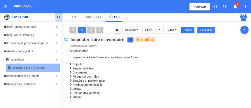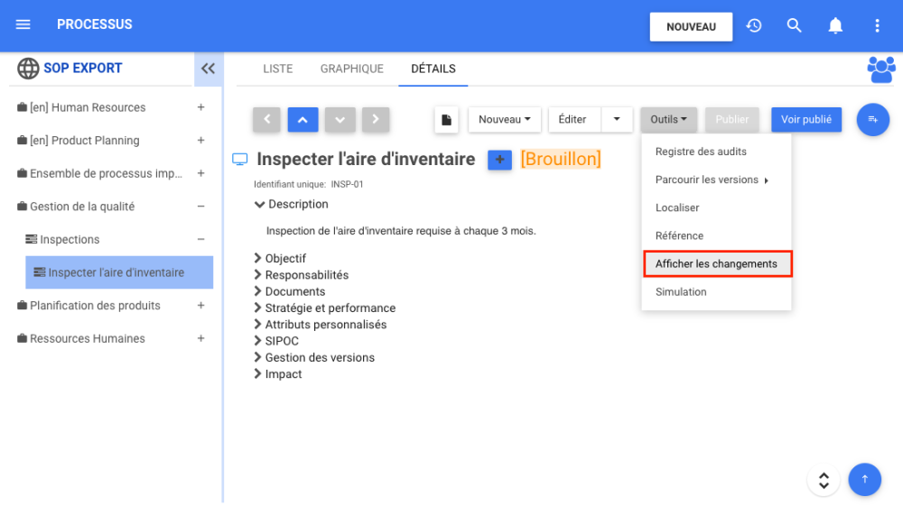 Les utilisateurs peuvent utiliser la fonctionnalité “Afficher les changements” pour comparer la page de détails de la version actuelle d’un objet EPC à la version précédemment publiée.