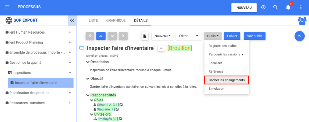3. Pour quitter la comparaison, sous Outils, cliquez sur Cacher les modifications
