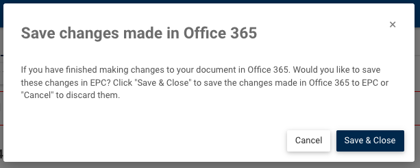 6. Cliquer sur “Sauvegarder et fermer” enregistrera automatiquement les modifications de l’utilisateur dans EPC, où il pourra voir le document mis à jour. Alternativement, pour annuler leurs modifications, les utilisateurs peuvent cliquer sur le bouton “Annuler”.