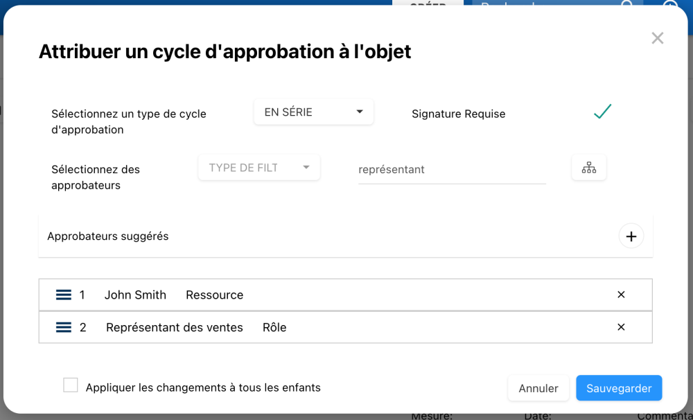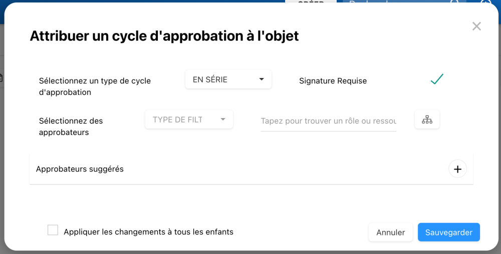 - Appliquer les modifications à tous les enfants : Si cochée, la configuration actuelle du cycle d’approbation sera appliquée aux sous-objets de cet objet.