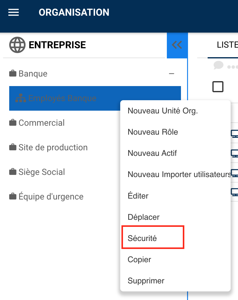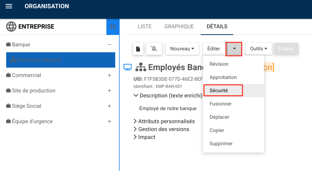 1. Naviguez jusqu’à l’objet souhaité dans l’arborescence hiérarchique et cliquez avec le bouton droit. Sélectionnez le bouton “Sécurité”. Le bouton de sécurité est également accessible dans la page Détails, sous le menu “Éditer”