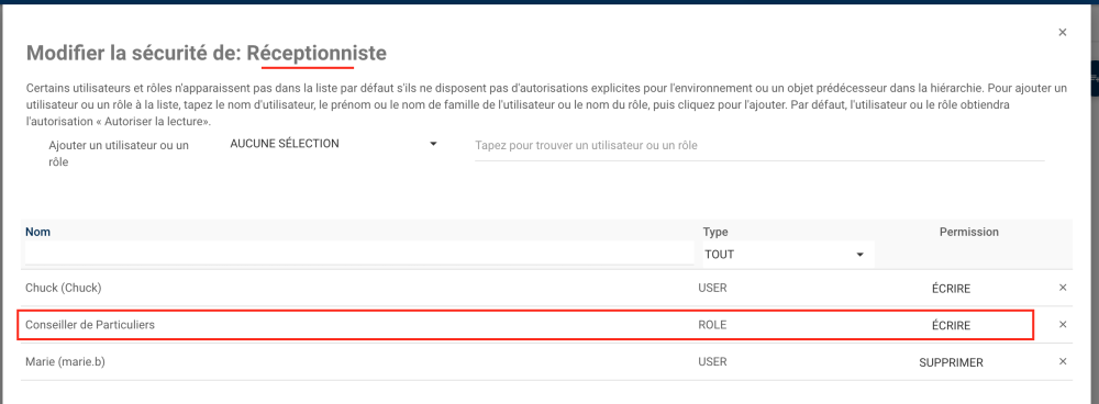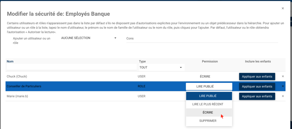 | Lire publié | L’utilisateur pourra voir uniquement la version publiée de l’objet et ne verra pas les versions “en cours” (brouillon). De plus, ils ne pourront pas modifier ou supprimer l’objet. |