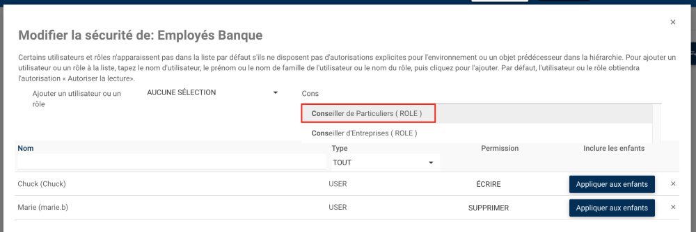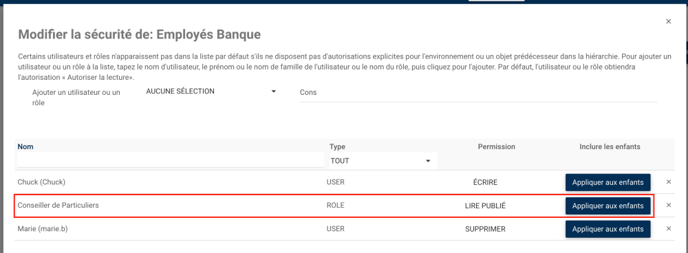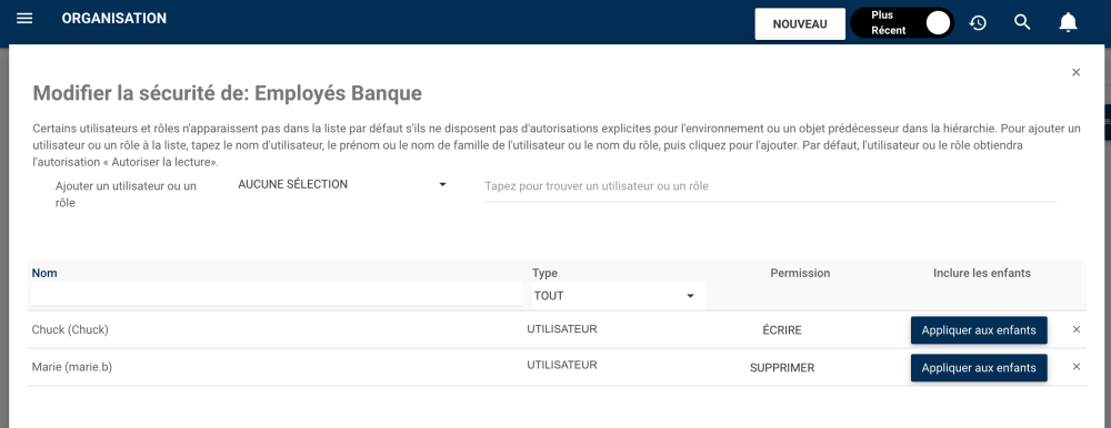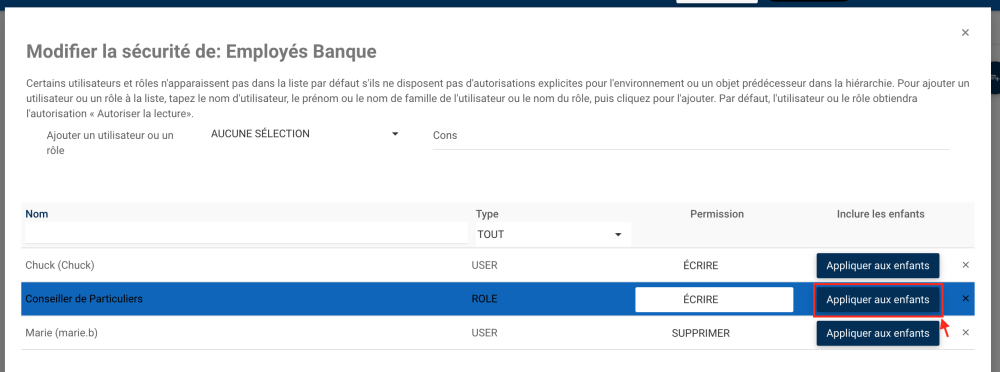 Les utilisateurs peuvent définir la sécurité des groupes ou des utilisateurs en leur accordant des permissions sur les environnements, les ensembles, les dossiers et les objets, tous indépendamment ou incluant leurs objets enfants, en cliquant sur la case “Appliquer aux enfants” ou “Appliquer à tous les objets”. Si cette case n’a pas été cochée avant la sauvegarde, la permission ne sera pas héritée par les objets enfants. Les paramètres des objets enfants peuvent être modifiés sans affecter les paramètres de ses parents.