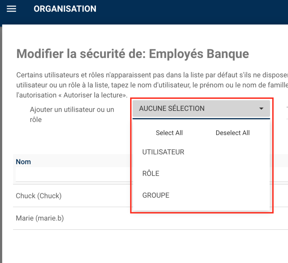 3. Pour ajouter un utilisateur, un rôle ou un groupe à la liste, les utilisateurs peuvent accéder à « Ajouter un utilisateur, un rôle ou un groupe » et sélectionner un filtre si nécessaire.