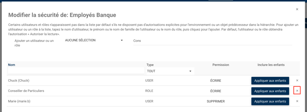 7. Pour supprimer l’autorisation de l’objet, cliquez sur le “x”.