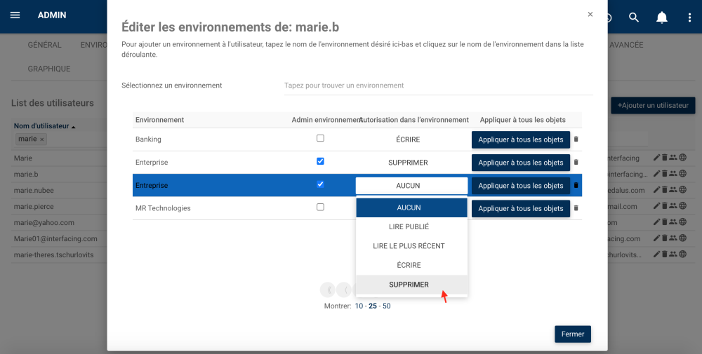 En revanche, si vos besoins de sécurité sont plus simples, il est possible de paramétrer ces permissions au niveau de l’environnement. De cette façon, vous pouvez accorder des autorisations à la fois, pour tous les objets de l’environnement en cliquant sur le bouton Appliquer à tous les objets.