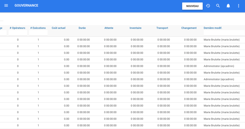 | Changement | La durée moyenne du temps consommé par Change Over entre opérateurs pour l’activité | Saisissez une durée au format DDDD HH:MM:SS |