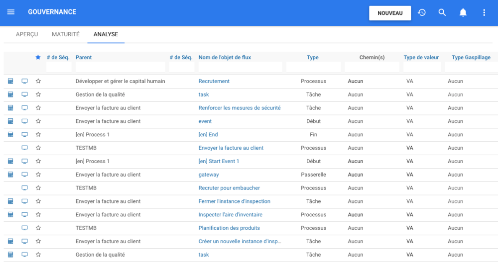 À partir de l’onglet Analyse du module de Gouvernance, vous pouvez modifier, analyser toutes les informations d’analyse de processus. À partir de là, vous pouvez également produire un rapport d’analyse de processus généré dynamiquement à partir des informations d’analyse de processus existantes.