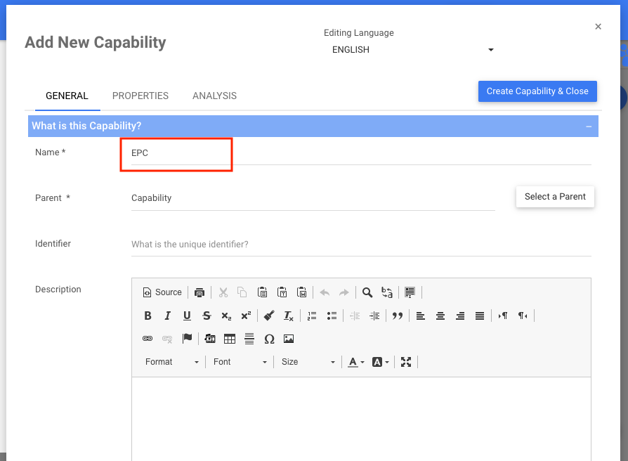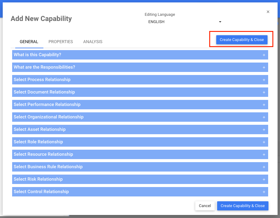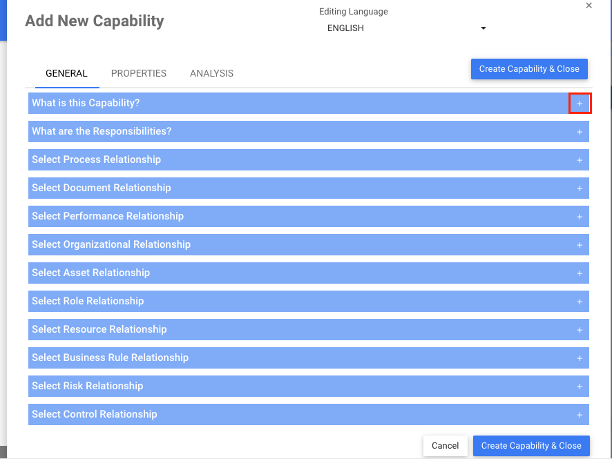 2. Use the and icons to expand and hide the different sections within each tab of the New Capability Window. Input the right information about the Capability in each section.