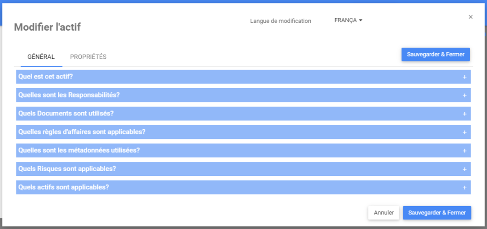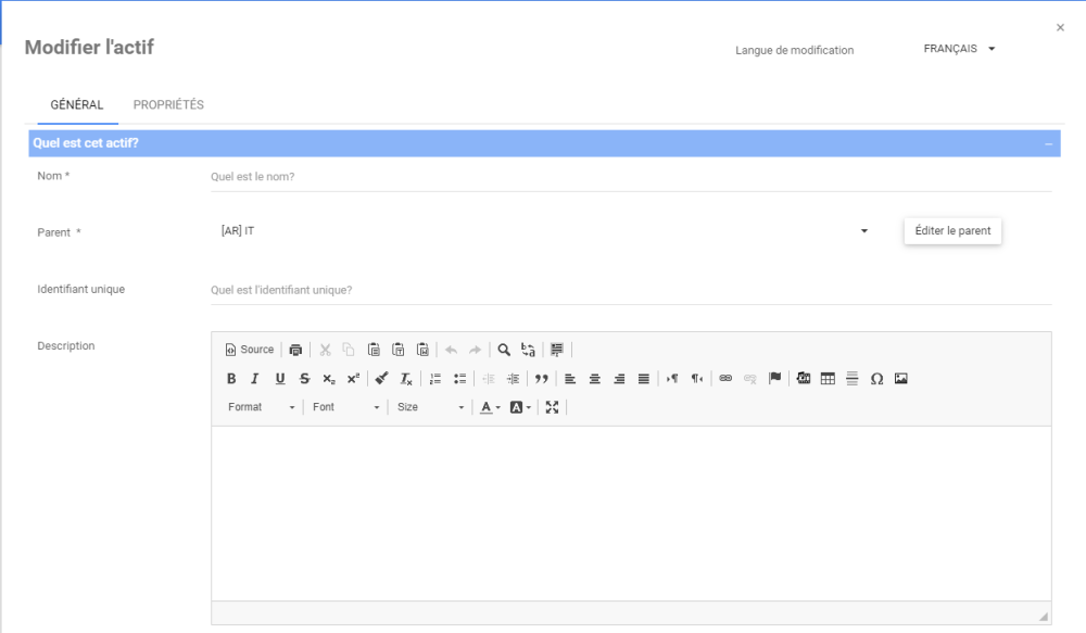 L’onglet Général contient une section pour les informations de base sur l’actif, ainsi que les sections responsabilités et associations.
