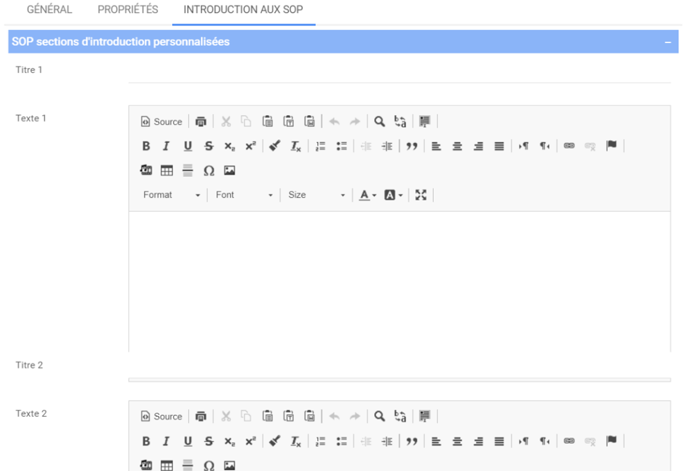 Il y a un troisième onglet intitulé “Sections personnalisées”. Cela permet aux utilisateurs d’entrer des en-têtes et du texte enrichi personnalisé qui seront injectés dans la sortie résultante. Cette fonctionnalité peut être utilisée comme alternative au contenu codé en dur dans les modèles lors de la génération d’une procédure standard d’exploitation. Le contenu statique peut être mis dans ces sections et rapidement modifié en fonction des besoins de l’entreprise.