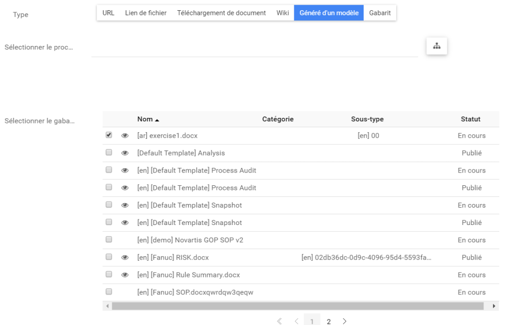 2. Sélectionnez un processus qui sera utilisé pour générer le document. Le contenu du document sera rempli avec des informations du processus sélectionné. Après avoir sélectionné le processus, choisissez un modèle à partir duquel le document sera généré.