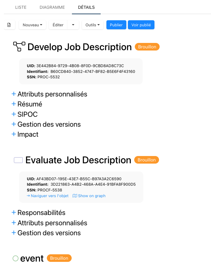 2. Publiez le processus en utilisant le bouton ‘Publier’ disponible sous la Vue des détails et diagramme du processus.