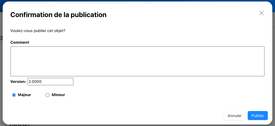 3. La fenêtre de confirmation de publication pour l’objet sera générée. Vous pouvez saisir un commentaire et consulter/mettre à jour le numéro de version. Le numéro de version ne peut être que supérieur au numéro de version précédent. Pour publier, cliquez sur ‘Publier’.
