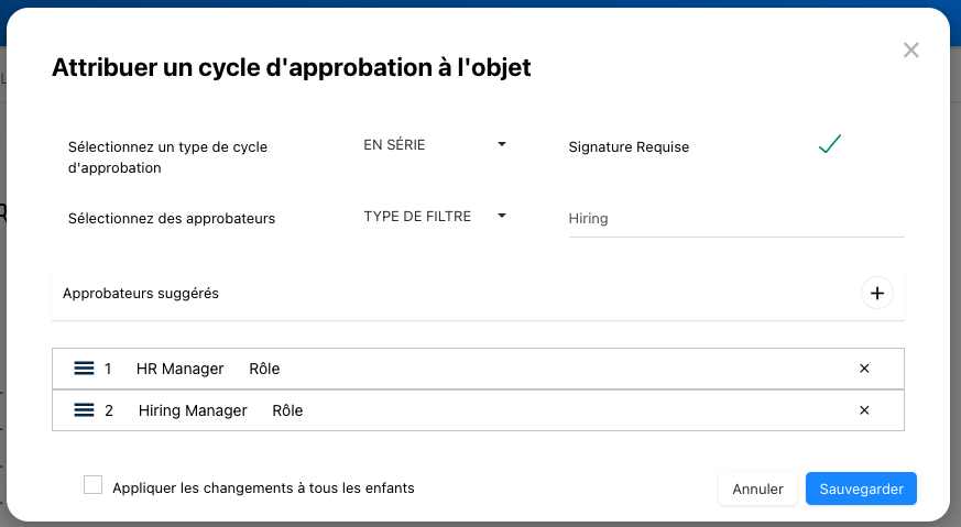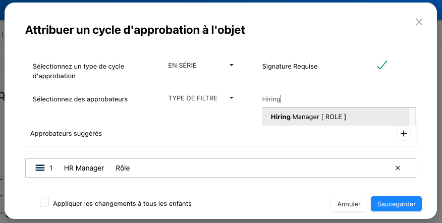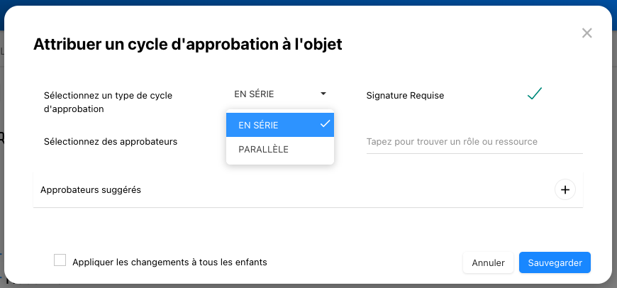 - Une fenêtre sera générée vous permettant d’assigner le cycle d’approbation du processus. Sélectionnez le type d’approbation ‘En série’.