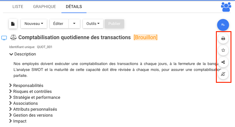 La barre d’outils offre aux utilisateurs une variété de fonctions pour naviguer et exploiter la page de détails.