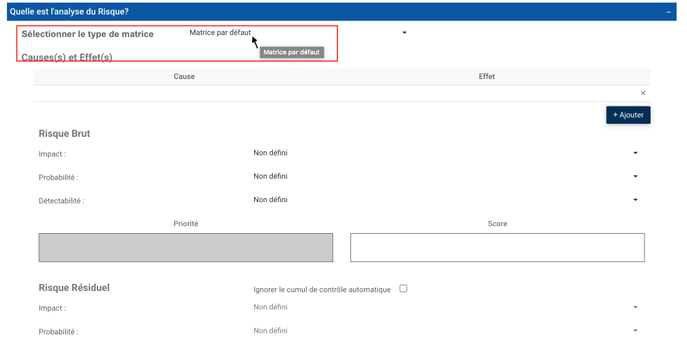- Définissez la matrice des risques, y compris la sélection du type de matrice des risques, ainsi que les paramètres de priorité et de détectabilité des risques,