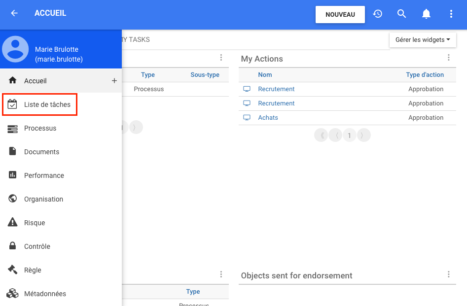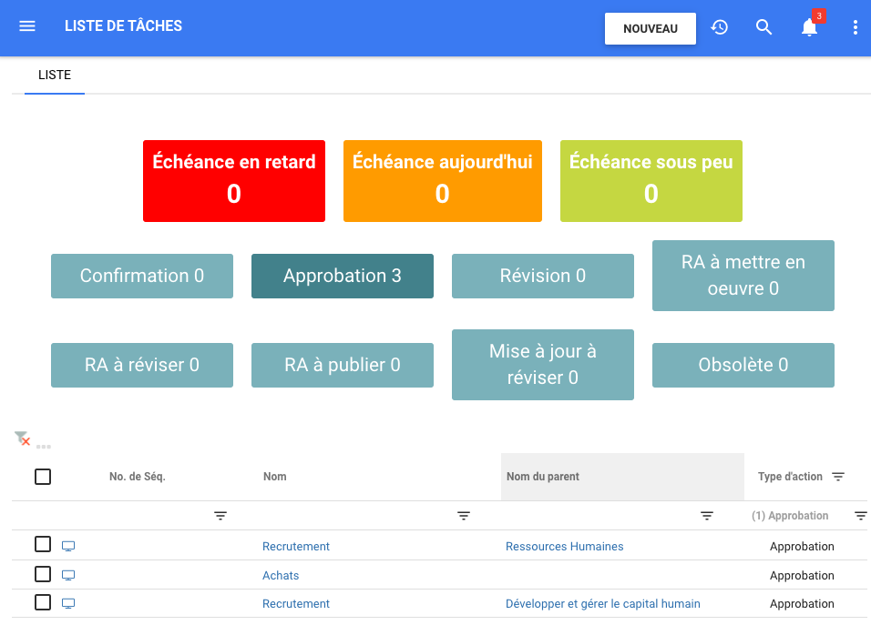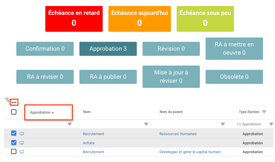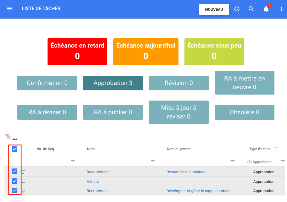 La fonctionnalité d’approbation de masse permet aux utilisateurs avec des profils d’approbation de pouvoir approuver en masse les tâches qui apparaissent dans leur liste, afin de gagner du temps sur les tâches en attente.
