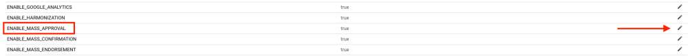 2. Accédez à la configuration nommée ENABLE_MASS_APPROVAL pour désactiver l’option de masse en cliquant sur l’icône du stylo et en saisissant “false”, puis sauvegarder.