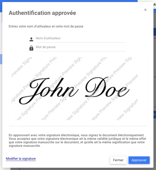 6. Si l’expéditeur a soumis l’approbation avec la signature requise, l’approbateur verra une fenêtre d’authentification. Dans le cas contraire, les objets seront approuvés sans authentification de signature.