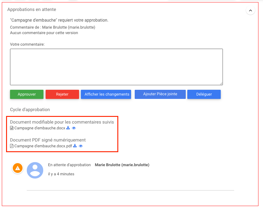 | L’option de visualiser le document est disponible dans la case d’approbation en attente, dans la case d’approbation après son approbation et dans la case d’approbation après la publication de l’objet. |