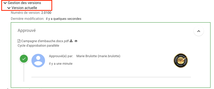 6. Après la publication, l’utilisateur peut toujours accéder au document d’approbation en cliquant sur Gestion des versions