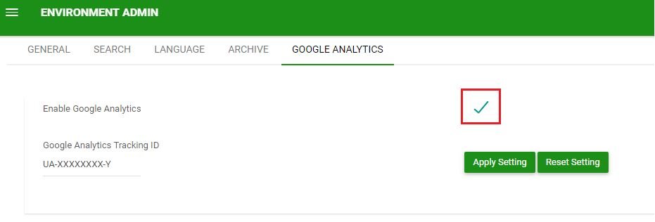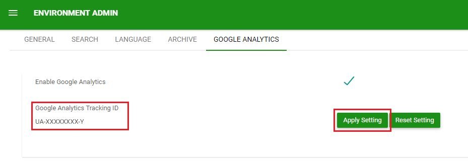 Pour configurer Google Analytics pour EPC, vous aurez besoin d’un compte Analytics. Google Analytics peut ensuite être configuré à partir du menu Admin Environnement, sous l’onglet Google Analytics.