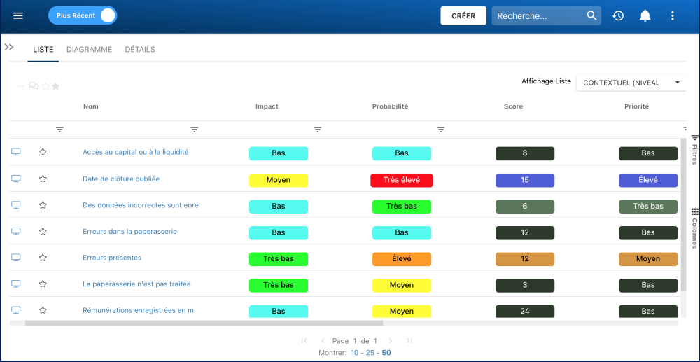 Dans la vue Liste du module Risque, nous avons introduit un système de codage couleur pour signifier les niveaux d’impact, de probabilité, de score, de détection et de priorité, basés sur la matrice de risque prédéfinie. Cette mise en œuvre remplit deux objectifs principaux :