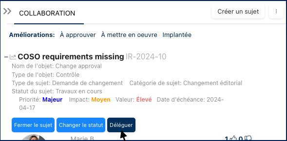 - L’Auteur trouvera un bouton “Déléguer” dans l’onglet collaboration des demandes de changement spécifiques sur tous les modules (sauf les modules Collaboration et Gouvernance).