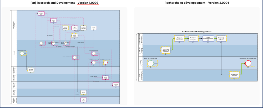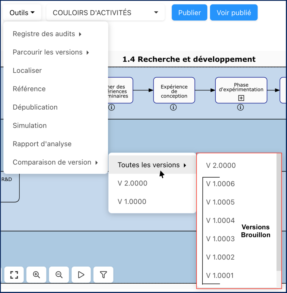 Nous avons amélioré l’outil ‘Comparaison de version’ pour permettre la comparaison des versions précédentes de brouillon. Cette amélioration permet aux utilisateurs de comparer les diagrammes à différentes étapes de développement avant leur publication finale.