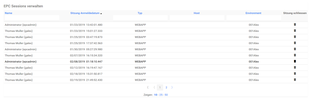 Die Verwaltung von EPC-Sitzungen wird von Systemadministratoren verwendet, wenn eine begrenzte Anzahl von Sitzungen gleichzeitig geöffnet werden kann. So können beispielsweise nur zehn Sitzungen gleichzeitig geöffnet werden, und es sind derzeit 10 Benutzer im EPC angemeldet. Wenn sich Benutzer 11 anmelden muss, kann der Systemadministrator die Sitzungen schließen, die derzeit nicht verwendet werden, aber wo sie geöffnet bleiben, damit sich Benutzer 11 am EPC anmelden kann.