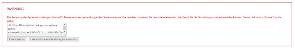 3. Das erste angezeigte Kästchen ist eine Warnung für den Systemadministrator, der ihn nun wissen lässt, wie das Ändern der Systemeinstellungen Probleme verursachen und das System sogar unzugänglich machen kann. Ein Link zur Wiederherstellung der Einstellungen ist eine Stunde lang gültig.