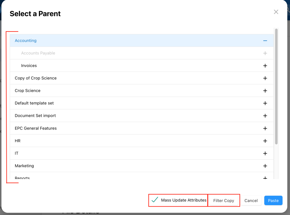 - Mass Update Attributes: This checkbox is enabled by default and allows you to add and edit the attributes assigned to the record. If unchecked, the document will be copied with its existing attributes. This window will be generated upon selecting the ‘Paste’ button.