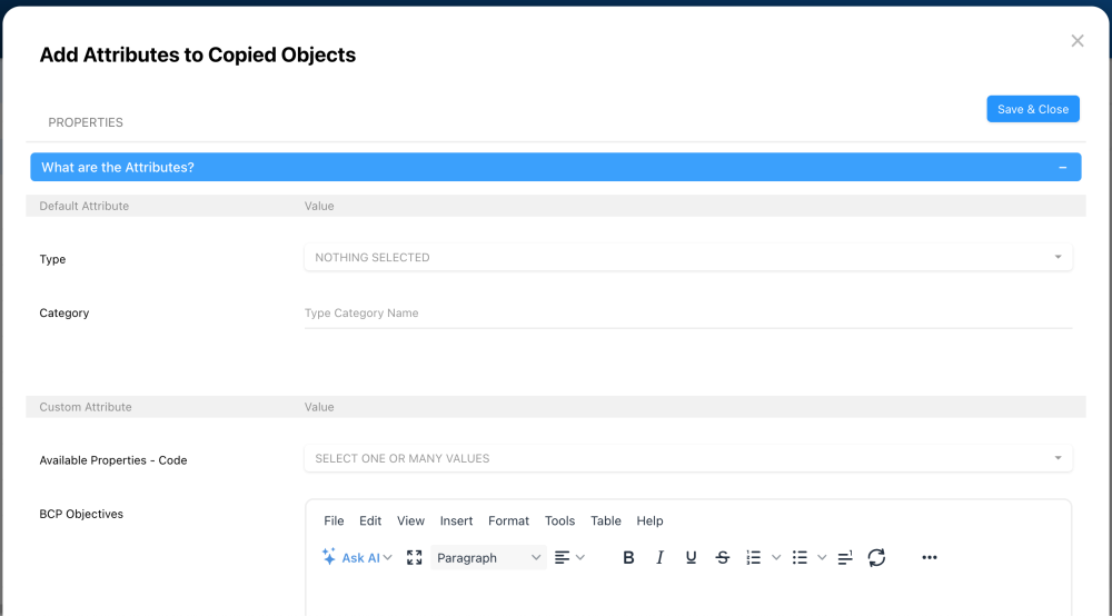 - Mass Update Attributes: This checkbox is enabled by default and allows you to add and edit the attributes assigned to the record. If unchecked, the object will be copied with its existing attributes. This window will be generated upon selecting the ‘Paste’ button.