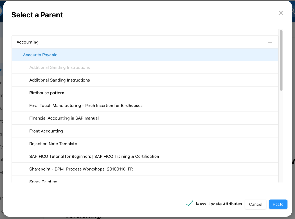 - Mass Update Attributes: This checkbox is enabled by default and allows you to add and edit the attributes assigned to the records. If unchecked, the objects will be copied with their existing attributes. This window will be generated upon selecting the ‘Paste’ button in the Select a Parent window.