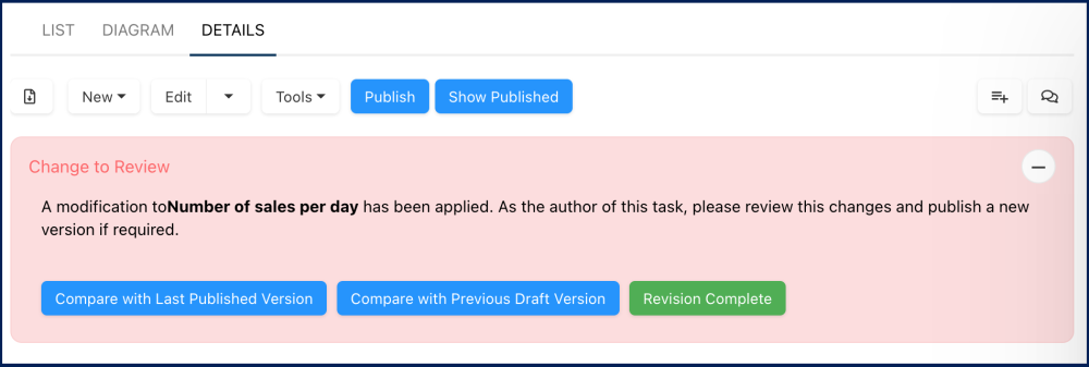 A Change to Review box will appear on the object’s Details view, allowing Authors to acknowledge and confirm they have seen the changes.