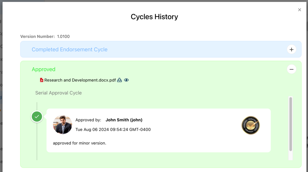 - In the pop-up window, users will see boxes with all completed cycles for this version (approval, endorsement).