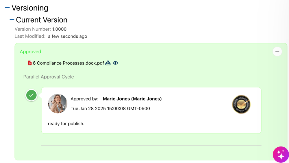 Once an object has successfully passed through signature compliance and the approval process, auditors can review the signed document by accessing the version history.