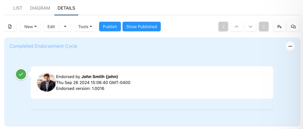 After an endorsement cycle is completed, a “Completed Endorsement Cycle” box will appear in the Details view and Diagram view for processes.