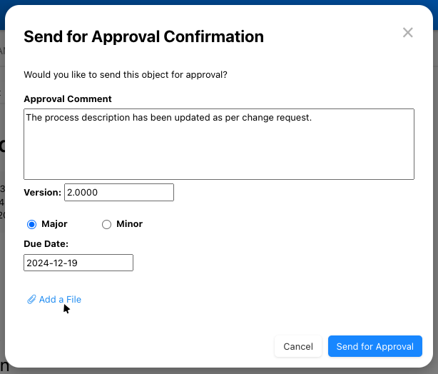 Users can now attach files when sending an object for approval, allowing them to provide detailed instructions or guidelines, for example.