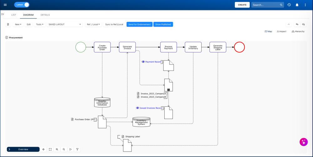 EPC’s Diagram Editor now supports artifact-to-artifact mapping, allowing organizations to connect documents and assets directly to one another. With this new ability, organizations can now create detailed Systems Relationship Maps that illustrate the connections between key data and process components, such as records, reports, software, and databases.