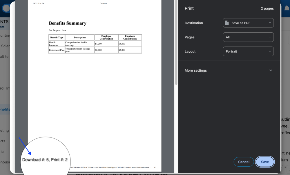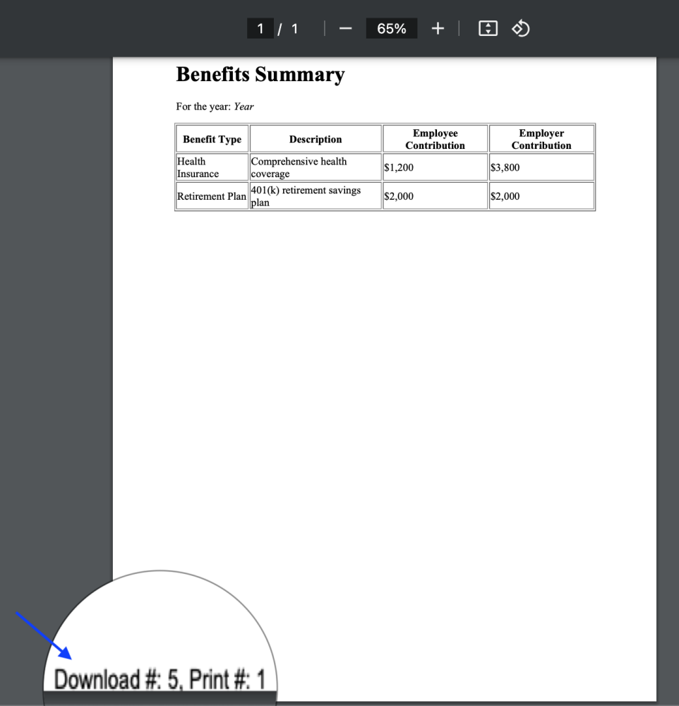 In PDF files, the download and print counts will be automatically injected in the bottom left corner of the first page, but only when the downloaded or printed copy is a PDF file.