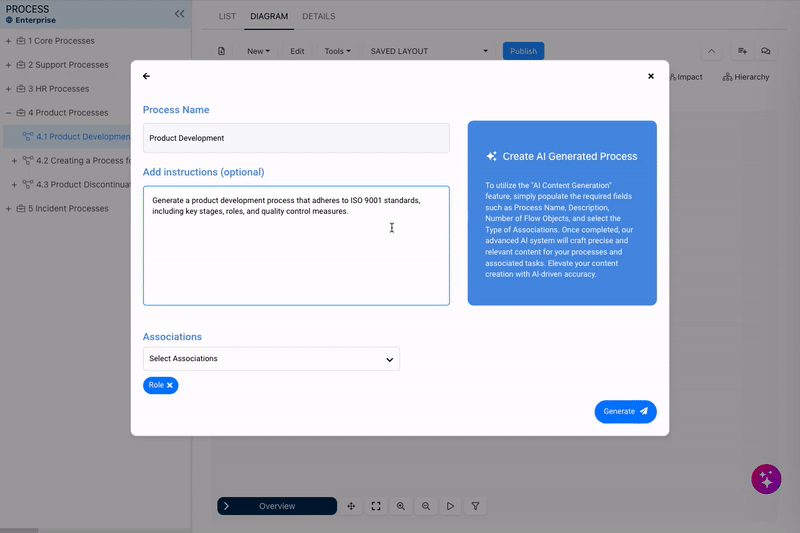 - Upon generating the process, the AI will automatically create the selected objects and associate them to the generated processes and flow objects.