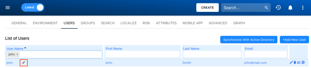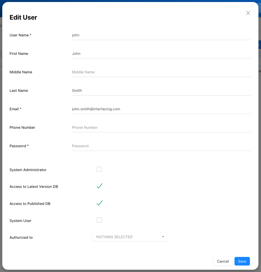 Administrators have the ability to edit user information as needed. System Admins can perform edits directly in-line within the user list or navigate to the edit section for more comprehensive editing capabilities. In the edit section, admins can grant or deny users, modelers, or admins the rights to publish, merge, import, or export objects.