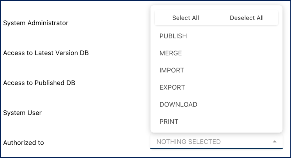 - Access to Published DB: Users with only this permission checked cannot be granted any additional authorizations.