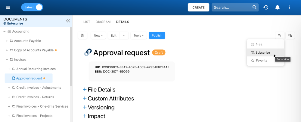 The Subscribe button is available for all objects within the List, Diagram & Details views.